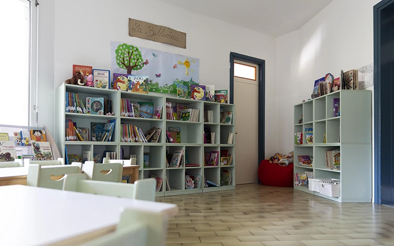 Situata all'ingresso della scuola, propone letture dedicate a tutte le fasce di età e comodi spazi pensati per svolgere attività quotidiane e ricreative.